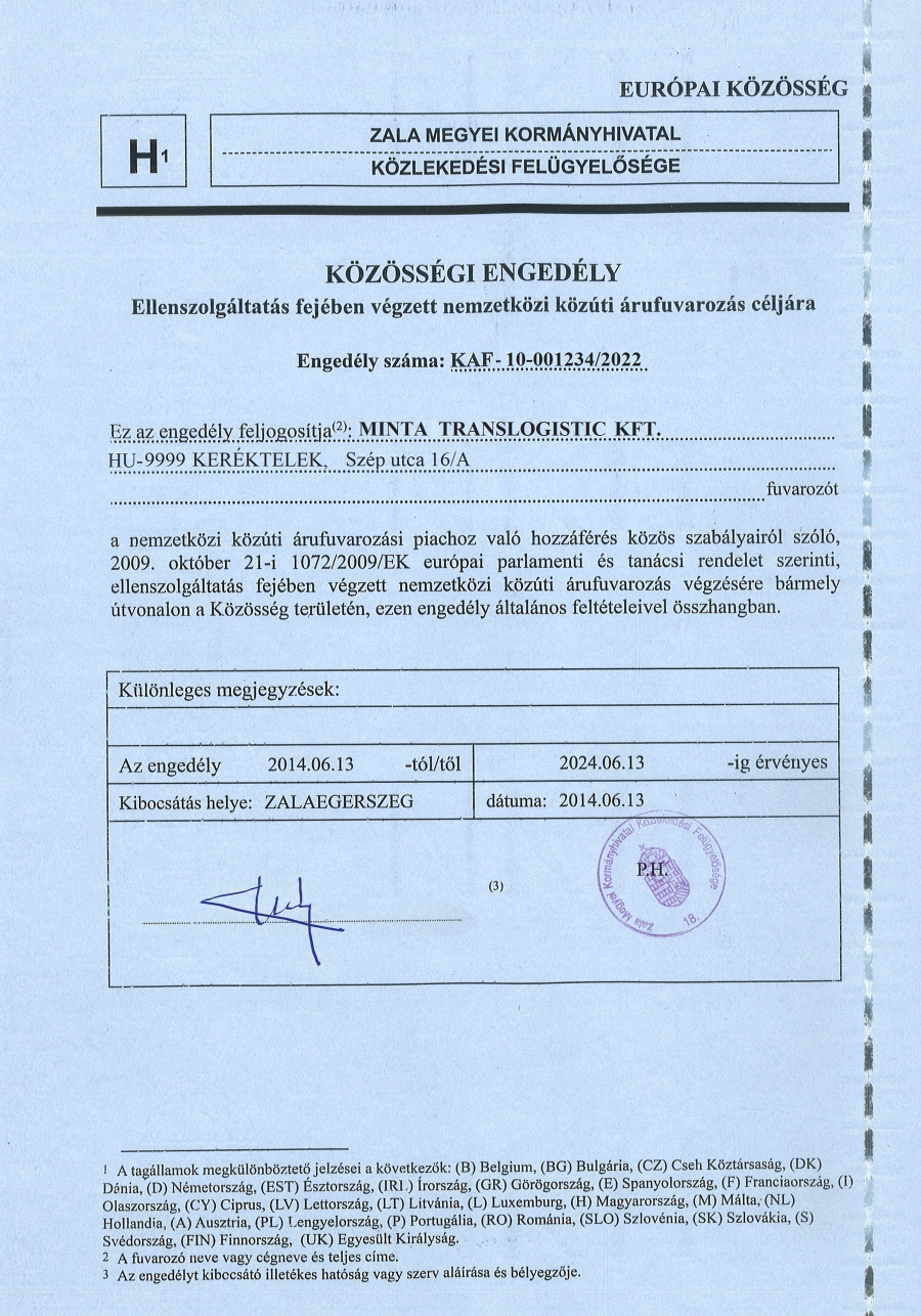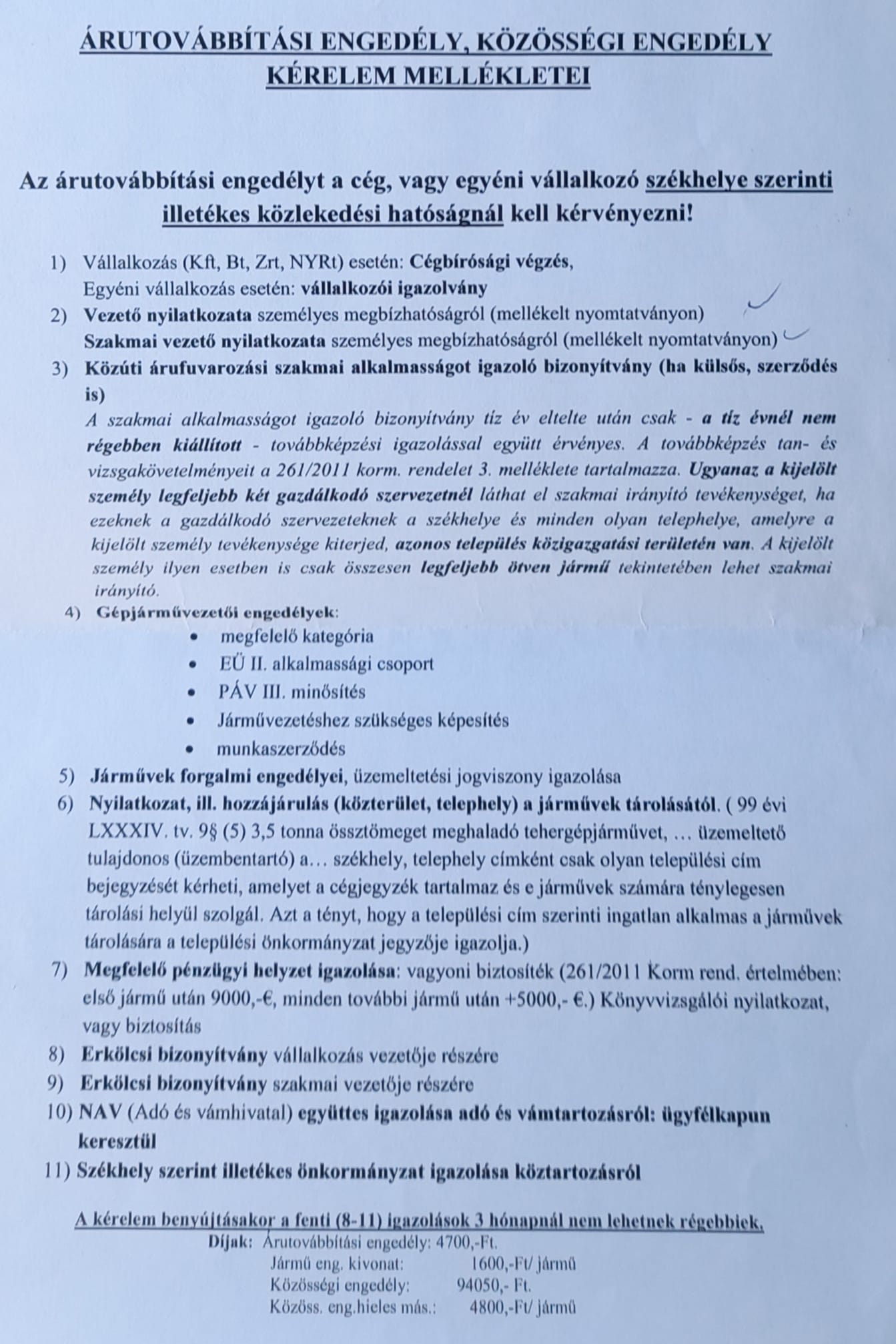 Az engedély kérelmet a területileg illetékes közlekedési felügyelethez kell beadni (pl:Pest megye komocsy u,BP.Mozaik utca.) Nem bonyolult csak várakozni kell kb 105ezer FT legyen nálad ha nemzetközit is kérsz nem csak belföldet. Ha minden meg van akkor egyből megkapod a lenti kék engedély papírt. Minden TGK -ra kell ilyen papír rendszám alapján müködik viszont csak egyszer kell a 104ezer Ft utánna autónként 8000ezer ha jól emlékszem.